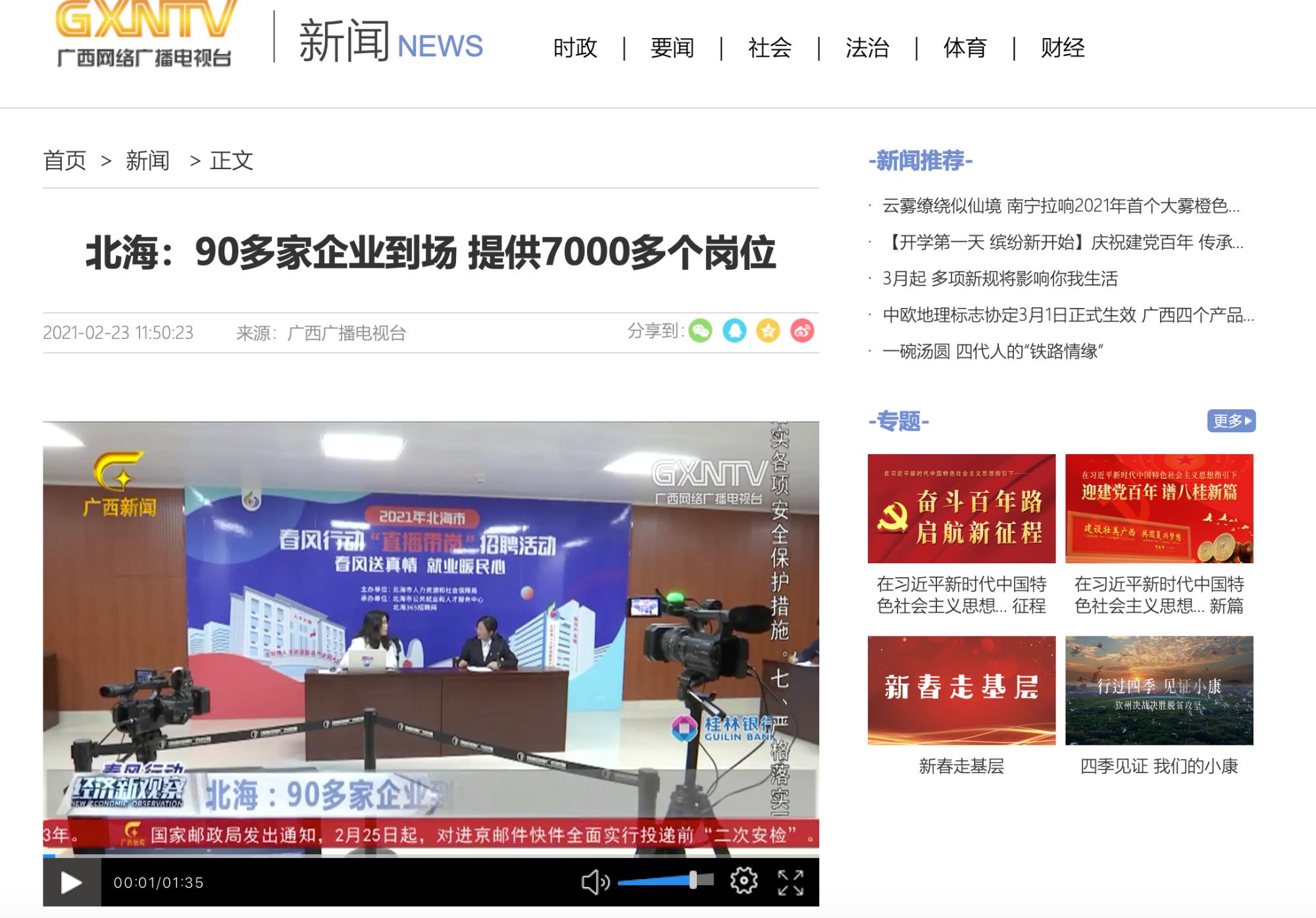 了解更多 >>由北京市人力资源和社会保障局主办、北京365承办的《春风行动》“直播带岗”开创了全新的招聘会形式。广西新闻频道对本次的直播行动进行了报道,对我们这种新颖并且高效的招聘方式表示高度赞扬!